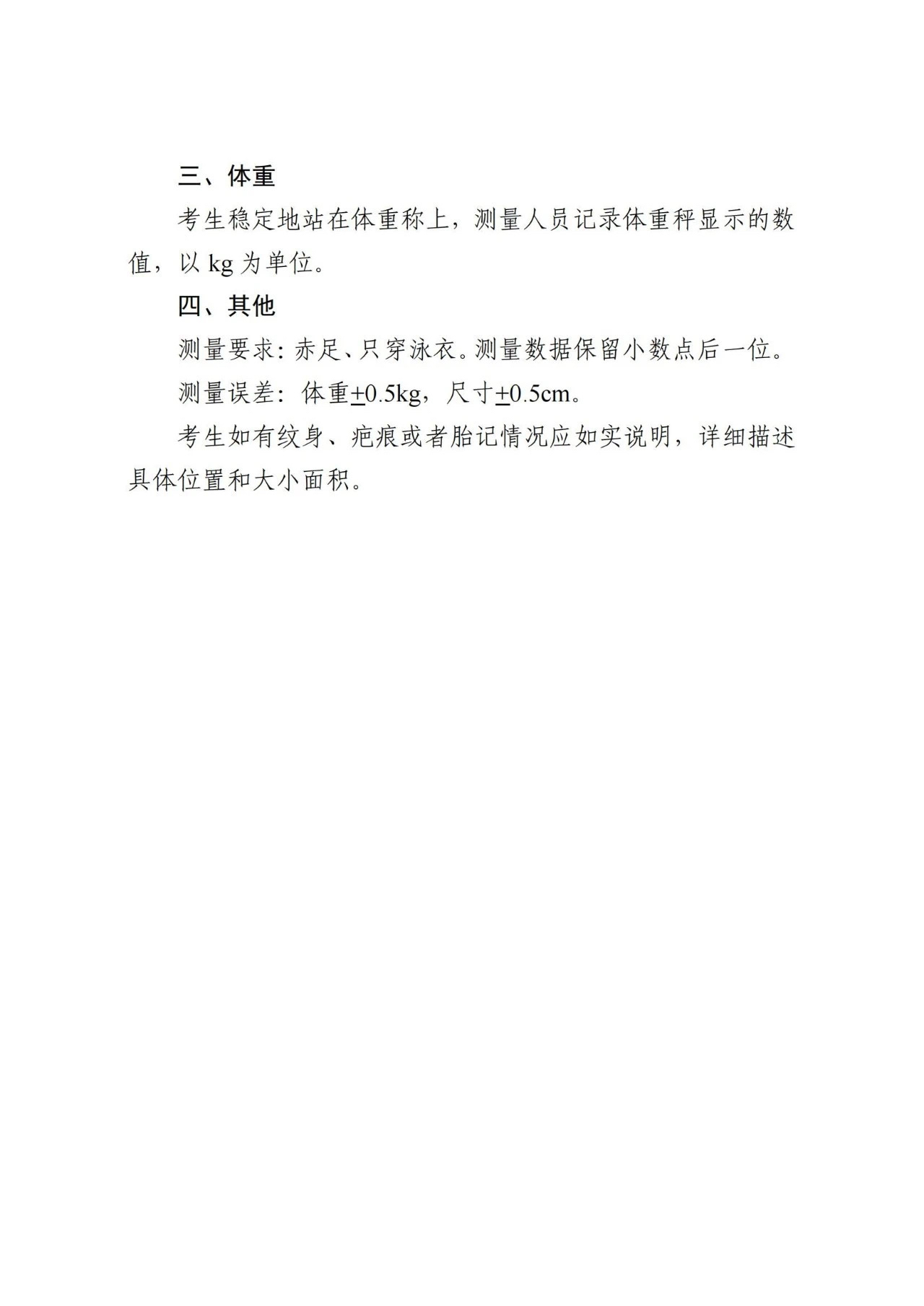 (1)形体形象观测科目:女生着分体式纯色泳装,泳裤为三角式,不可带裙边;男生上身裸身状态,下身着纯色三角泳裤。赤足。